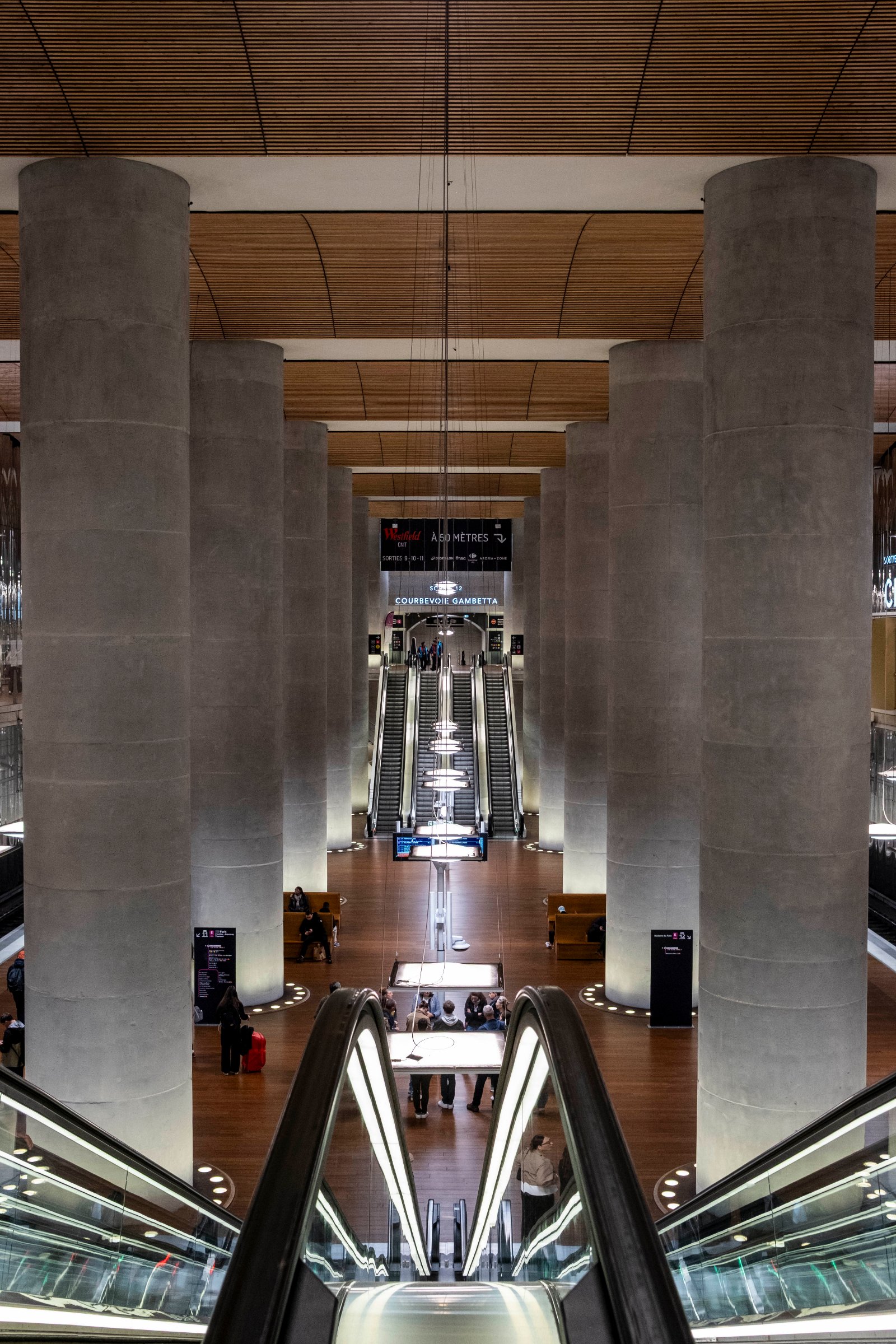 L’autre élément remarquable est la grande hauteur sous plafond de la gare, donnant un sentiment d’espace au-dessus des quais. « Avec un plan de voies situé à plus de 35m de profondeur, la hauteur de sous plafond de 18 mètres s’est imposée d’elle-même », précise Aurélie Carnel. Avec une conception en méthode traditionnelle par opposition à un creusement par tunnelier, il faisait sens de libérer l’espace entre la voie et les infrastructures du Cnit localisées au-dessus. La respiration offerte par la conception cathédrale de la gare est donc un bénéfice induit ».