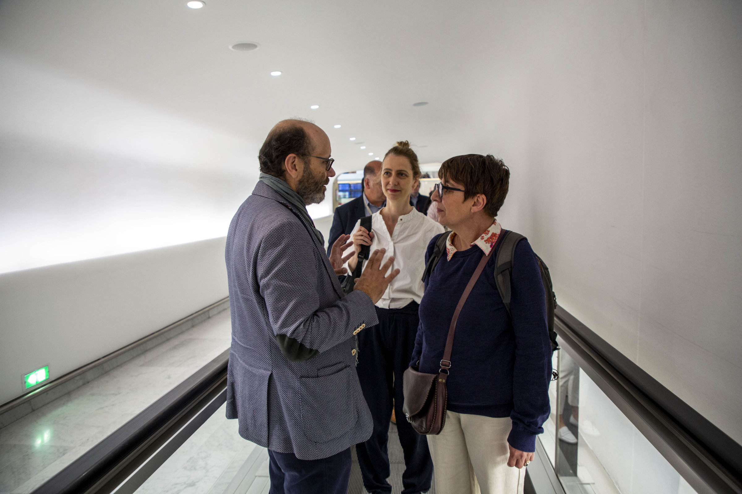 La troisième étape des « visites expertes » de l’IMOA consacrée au terminal 1 de l’aéroport CDG a débuté dans les bureaux situés au dernier étage pour une courte présentation du projet d’agrandissement du terminal historique conçu par Paul Andreu dans les années 1970 – projet d’agrandissement fondé sur la création d’une couronne extérieure qui, à terme, reliera tous les satellites. La présentation s’est faite à plusieurs voix : celles de Baptiste Maurand, directeur adjoint de la filiale ingénierie du Groupe ADP, de Rafaël Ricote, architecte en chef du groupe, de Loïc Marti, directeur des projets ADP et de Christophe Gérard, directeur du projet T1. Au préalable : un choix, radical, celui de conserver le corps central du terminal 1. Dans un contexte où l’aérien est en perpétuelle réinvention, où le trafic ne cesse de croître et où la sécurité de monter en puissance, ce choix est, à l’échelle internationale, unique ; il met la France en première ligne sur la question patrimoniale aéroportuaire. De fait, le corps central est respecté dans son fonctionnement, magnifié et « dupliqué » sur le nouveau bâtiment de jonction par un jeu de miroir, visible depuis le corps central.