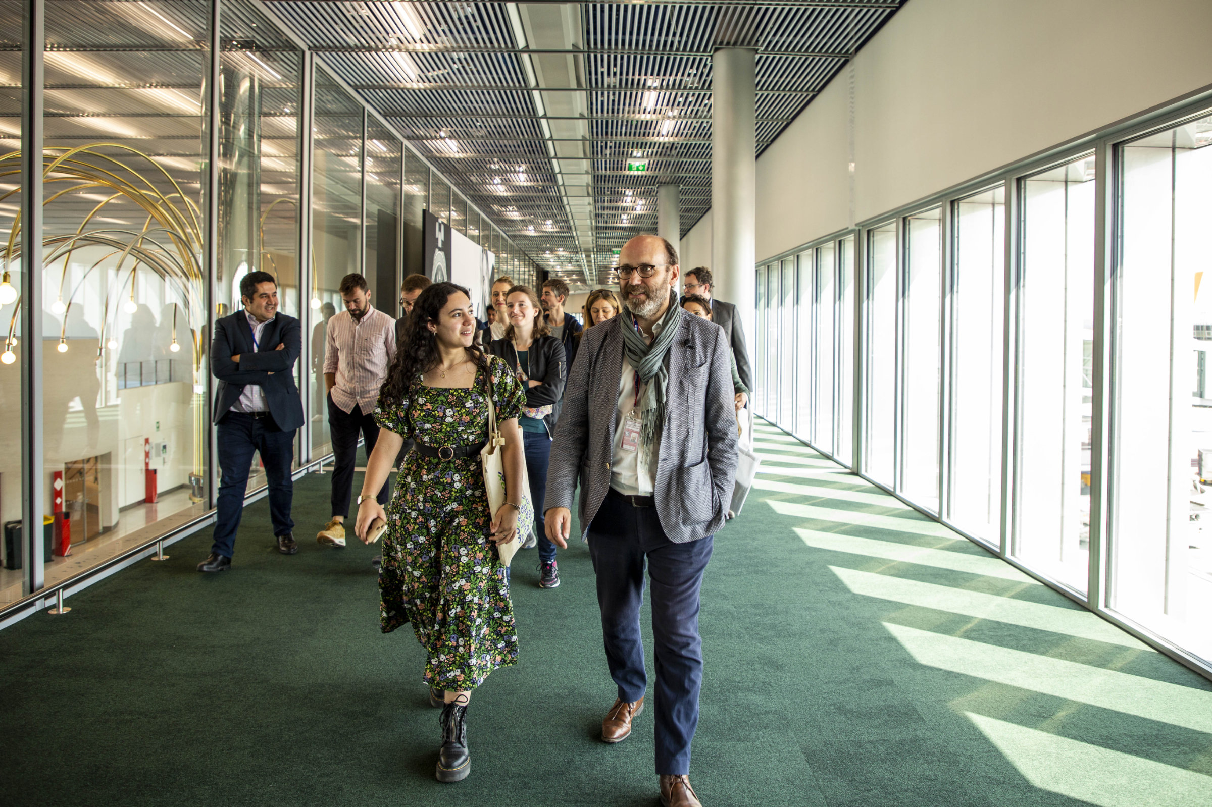 Place à la visite ! Les participants se sont rendus sur le site en passant par les postes de police et de sécurité, puis ont emprunté le « tunnel » extra-blanc redimensionné qui les a conduits vers le nouveau bâtiment construit à la place d’un satellite. Le point de vue est inédit, proche visuellement de la rotondité du bâtiment historique. L’opération, conçue, réalisée et pilotée par ADP, a cumulé les difficultés : un chantier situé au milieu des pistes, donc soumis à un contrôle permanent ; un chantier réalisé en interface avec l’exploitation de l’aéroport, donc soumis à un processus particulier ; un chantier, comme partout, interrompu par la Covid-19 ; un chantier aux multiples sujets techniques qu’il s’est agi de ne pas rendre visibles ; un chantier de taille avec ses 36 000 m2 créés et ses 5 200 m2 rénovés ; un chantier pionnier avec la mise en œuvre d’un nouveau concept, Extime, destiné à améliorer l’accueil des voyageurs… Une fin d’opération intense pour une livraison dans les temps, et une mise en exploitation comme prévu en décembre 2022.