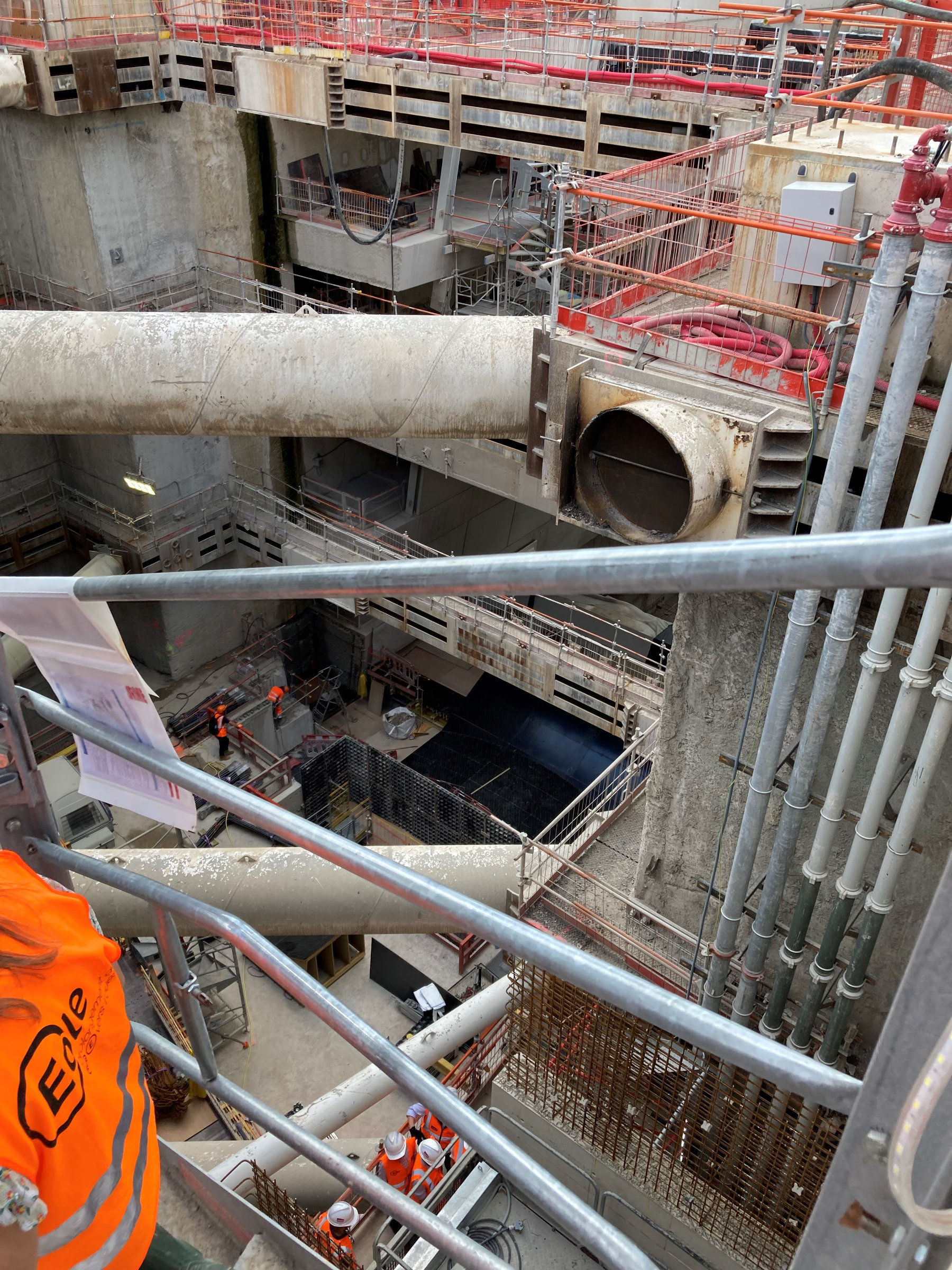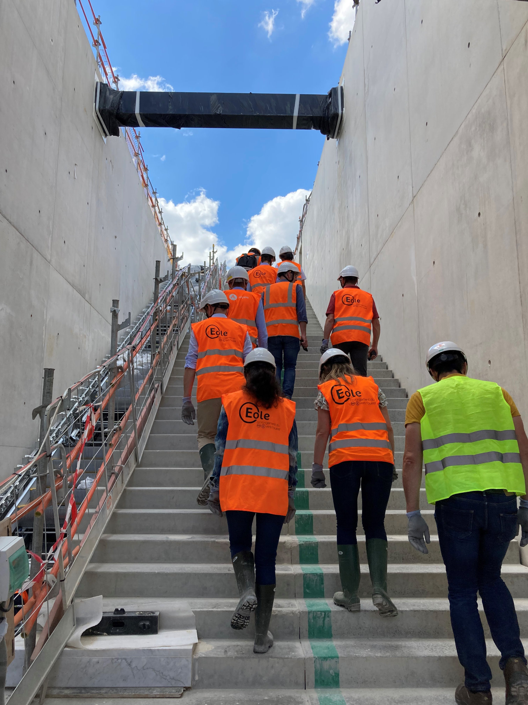 Le jeudi 23 juin après-midi, les « visites expertes » de l’IMOA se sont poursuivies à Paris, porte Maillot avec la visite du chantier d’Eole qui prolonge la ligne du RER E jusqu’à Nanterre. La gare Eole de la Porte Maillot est un futur point d’interconnexion majeure pour la région et indispensable aux JO. Guidés par SNCF-Réseau, les membres fondateurs de l’IMOA ont pu visiter un chantier très contraint qui doit faire face à un contexte d’une densité inouïe : en surface, où la ville bat son plein ; en sous-sol, où l’emprise de la gare d’Eole est cernée par des canalisations et réseaux tous azimuts, par le parking du Palais des Congrès sur lequel « mord » le projet, par les lignes des RER A et C, et surtout par la ligne 1 du métro, située à 2 mètres d’Eole. Autant dire que les garde-fous sont nombreux pour éviter de perturber ce voisin mitoyen !