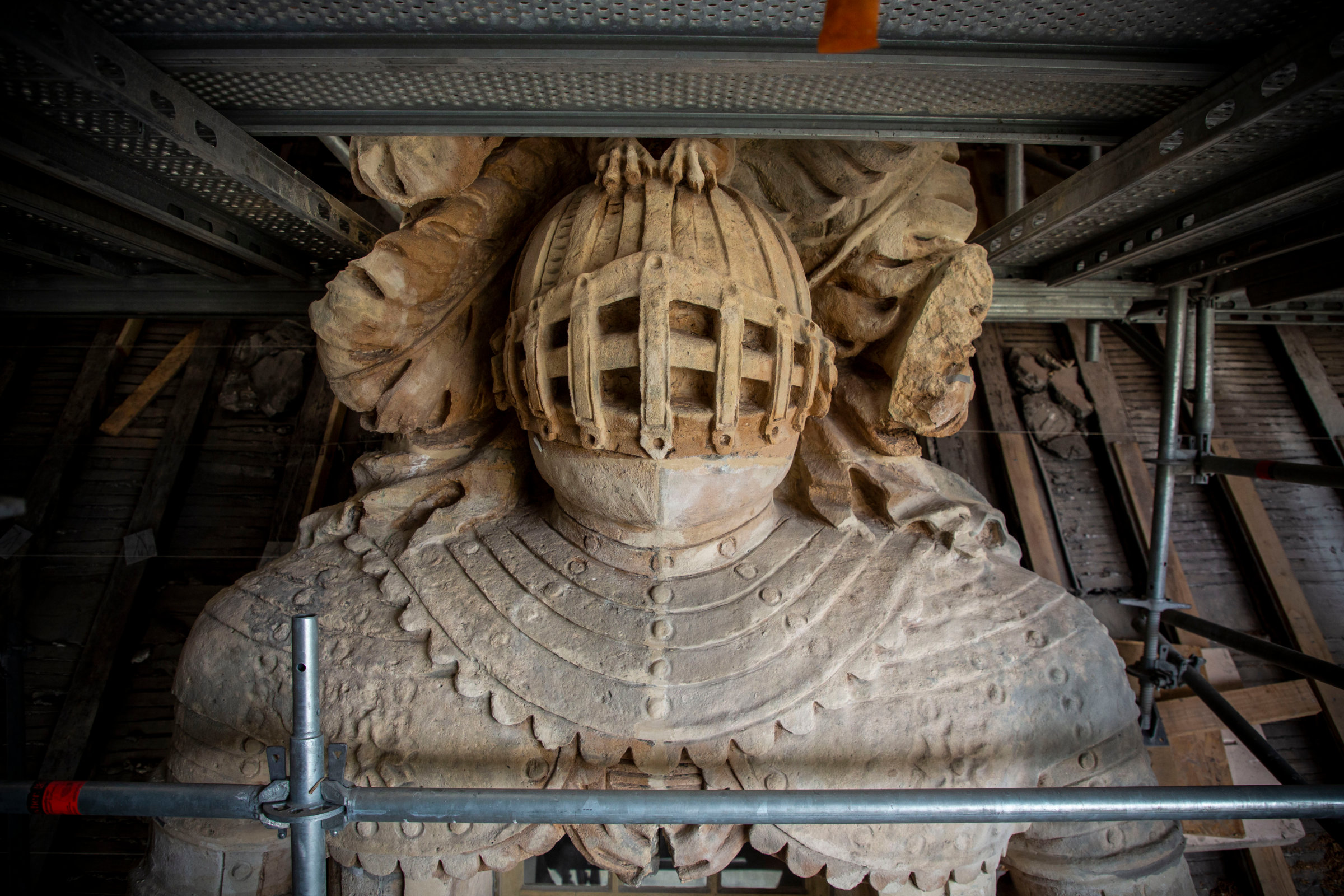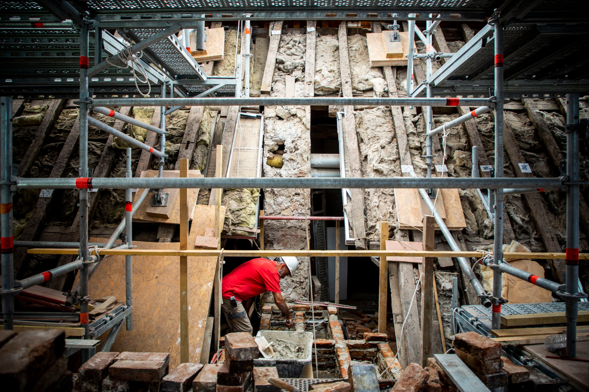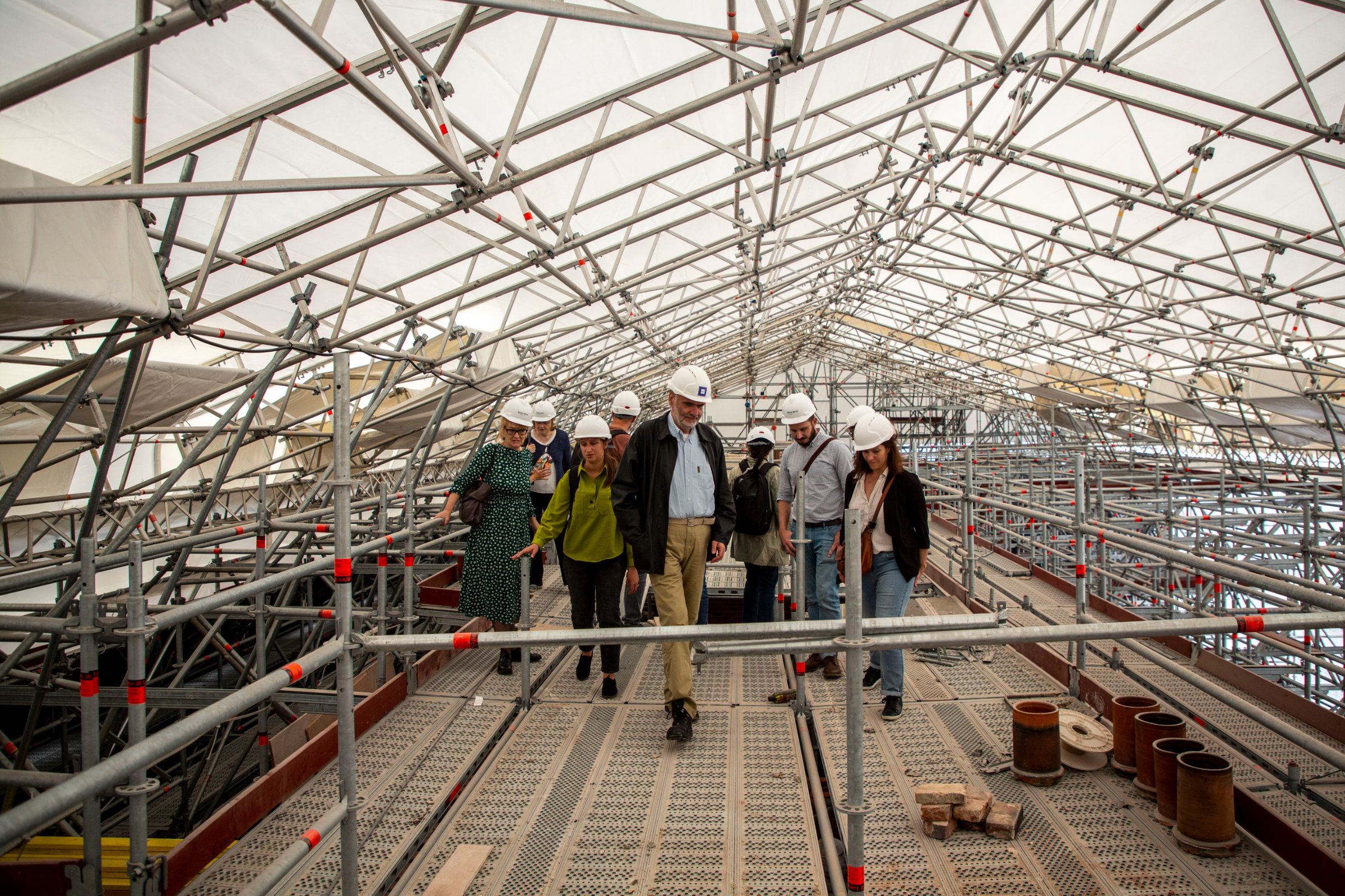Monument historique, l’Hôtel national des Invalides relève de la compétence d’un architecte en chef des monuments historiques pour toute intervention sur les clos et couverts. La restauration, pilotée par l’OPPIC, l’opérateur du ministère de la Culture, a par ailleurs la spécificité de se dérouler dans le cadre d’un Protocole culture et défense, entre le ministère de la Culture et le ministère des Armées qui participent à parts égales aux opérations sur les monuments historiques propriété des Armées. Le budget des travaux de restauration fait l’objet d’une programmation pluriannuelle sur différents sites. Tempo des JO oblige, la restauration de la façade sera finalisée avant l’été 2024 ! Accompagnés par Hugues Wilhélem (OPPIC), les participants à la visite ont pu grimper en haut des échafaudages qui enveloppent le corps du bâtiment en cours de restauration. Les visiteurs sont passés le long des lucarnes sculptées et des pans du toit où des couvreurs œuvraient. Puis il a fallu redescendre. Fin de la visite.